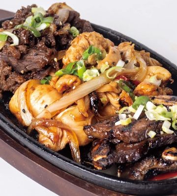 A trio of our signature BBQs - Bulgogi, LA Galbi, and Chicken BBQ. Served izzling on a hot plate with vegetables