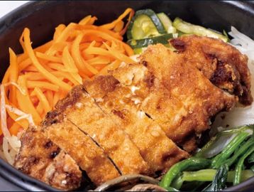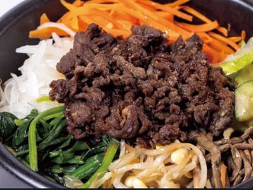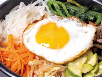 Mixed rice with assorted vegetables and a fried egg, served in a hot stone bowl. Enjoy by mixing with the spicy gochujang sauce on the side.