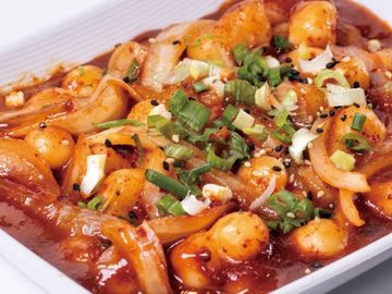 Rice cakes simmered in a sweet and spicy house gochujang sauce with vegetables