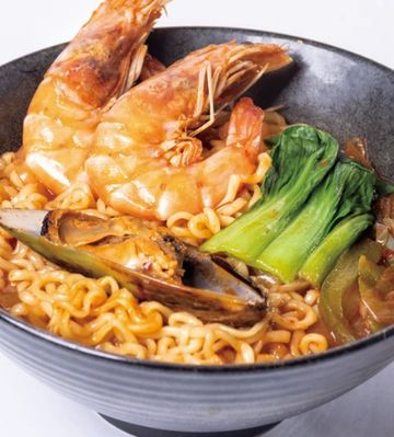 Head-on shrimps, mussel, seafood mix, bok choy, onions, green onions, bell peppers, wood ear mushrooms