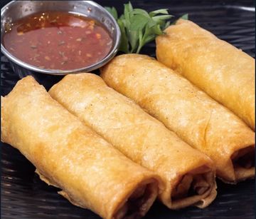 Spring rolls filled with vegetables with house secret sauce on the side (4 pieces)