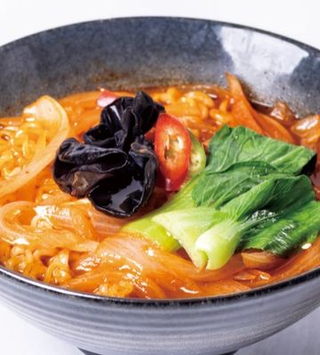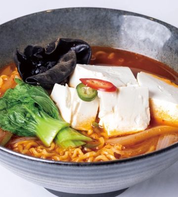 Soft tofu, bok choy, onions, green onions, bell peppers, wood ear mushrooms